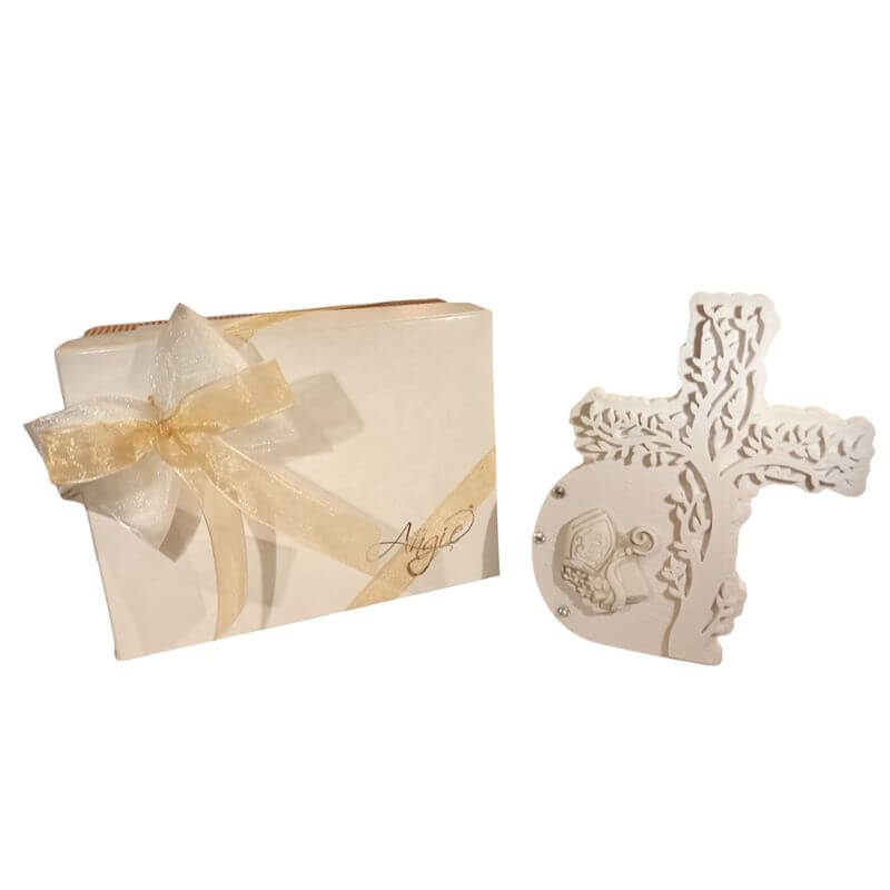 Scultura in gesso con base in legno, inclusa di scatola con nastro e confetti al cioccolato o alla mandorla.